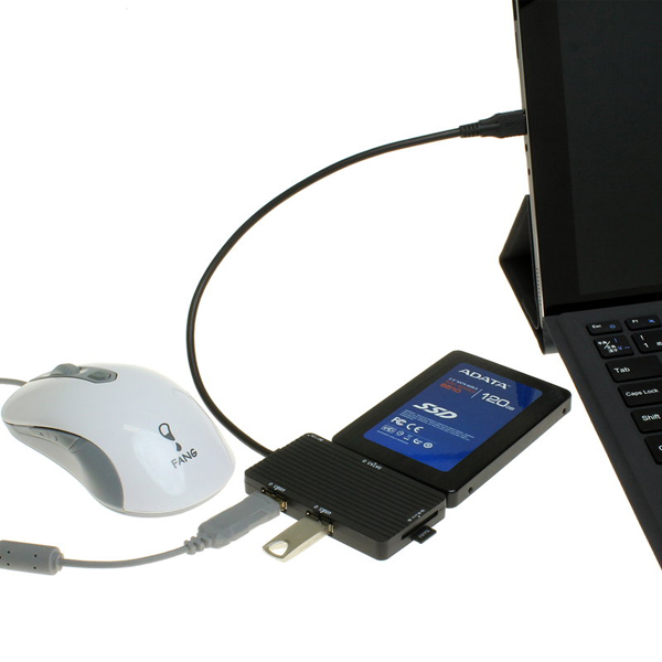 同製品は、Type-C搭載のWindows PCや新型Mac Bookに、大容量ドライブやマウス、キーボードなどを接続できる製品。USB(TypeA/Type-C)およびSATA規格は3.0の高速データ転送が可能で、カードリーダーにはmicroSDおよびSDカードを挿入できる。