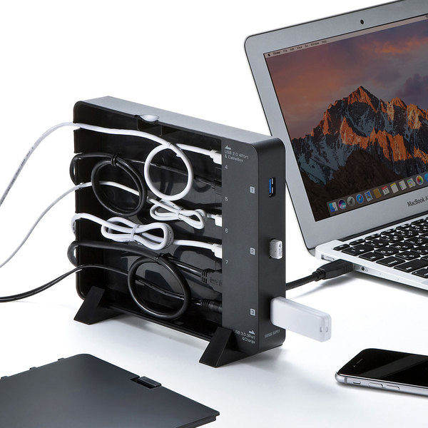サンワサプライ、ケーブル収納BOXを一体化させた配線スッキリの7ポートUSBハブを発売