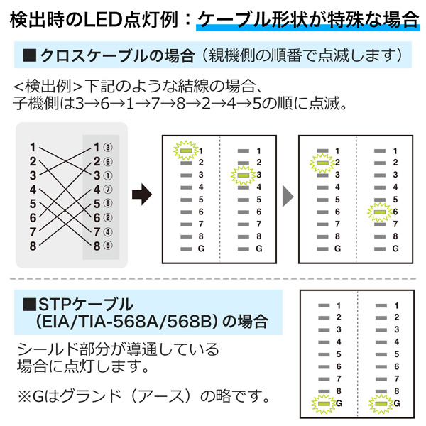 本製品は、親機と子機にそれぞれケーブルの両端を差し込むことで、導通・断線・結線ミス、STPケーブルのグランドの有無を確認することができる。ケーブルの結線状態は順番に点灯するLEDランプで表示され、8つの芯線を素早くチェックすることが可能だ。