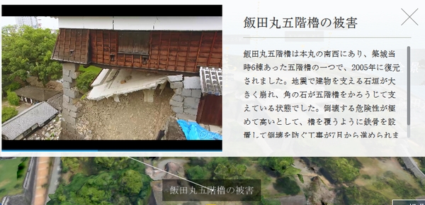 「熊本城の姿」では3Dマップで被害を受けた熊本城の様子を眺められる。3Dマップは回転や拡縮が可能で、建物を隅石だけで支えている“一本石垣”状態の「飯田丸五階櫓」「西出丸」などは被害についての詳細や上空などから撮影した動画も見られる。
