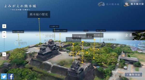 日本放送協会(NHK)は、公式ホームページNHKオンラインのDATANAV!に、地震被害を受けた熊本城の姿を伝えるCGと動画、全国からの手紙と写真を紹介するWebコンテンツ、「よみがえれ熊本城」を公開している。