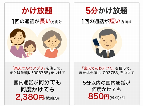 楽天モバイル、月額2380円で国内通話無制限のプラン「楽天でんわ かけ放題」開始