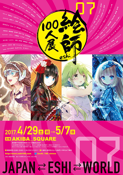2017年4月29日(土・祝)〜5月7日(日)に、秋葉原UDX 2FのAKIBA_SQUAREで「絵師100人展07」が開催される。ゲームなどの日本発信の文化“クールジャパン”の最前線で活躍し、ファンから“絵師”と呼ばれることもあるイラストレーターたちの描き下ろし作品を展示。この「絵師100人展」は7回目の開催となり、今回は“融合”がテーマとされている。開館時間は10:00〜20:00(入場は閉館30分前まで)で、入場料は1000円(中学生以下は無料)。