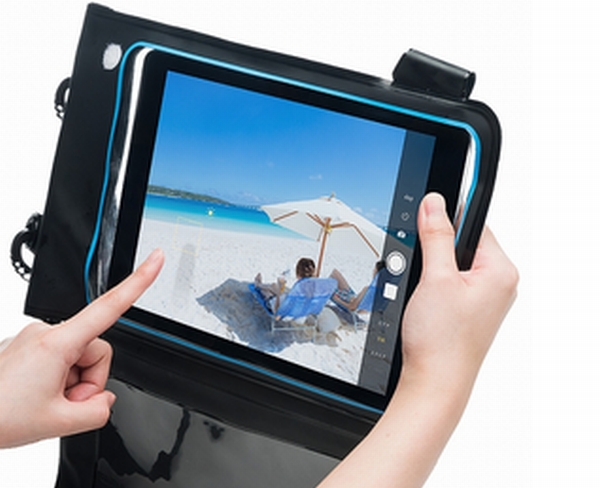 タブレットを収納する部分はIPX7相当の防水機能を有し、水がかかる・軽く水につける程度ならばタブレットを水から守ってくれる。また、ケースに入れたまま画面操作することも可能。