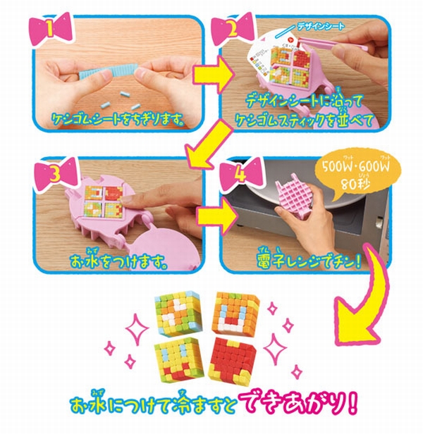 本製品は、2009年に発売された「オリケシ」の復刻版。前モデルは170万個以上を出荷しヒットを記録した商品。復刻版も消しゴムの作り方は同じで、ケシゴムスティックをデザインシートに沿って本体に並べ、水に漬けた後に電子レンジで加熱すれば、スティック同士がくっついて、ドット絵風の消しゴムが出来上がる。