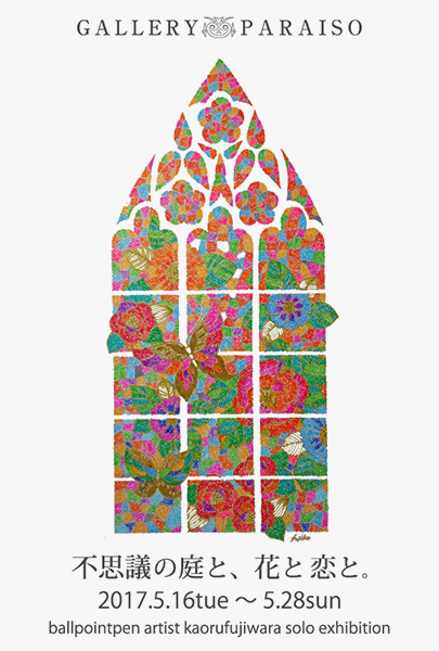 2017年5月16日(火)から5月28日(日)まで、ギャラリーパライソにて、藤原かおる氏による「不思議の庭と、花と恋と。」が開催される。同氏にとって、ボールペンイラスト作家として初めての個展。2016年の阪神梅田本店「第2回デニム博」への出展時にTONYBEEとのコラボレーションで生まれた「不思議の庭」の世界観をテーマとして作品を展開しており、会場全体でも「不思議の庭」の物語が表現されている。入場無料、月曜定休で、時間は12:00〜20:00(日曜は17:00まで)。