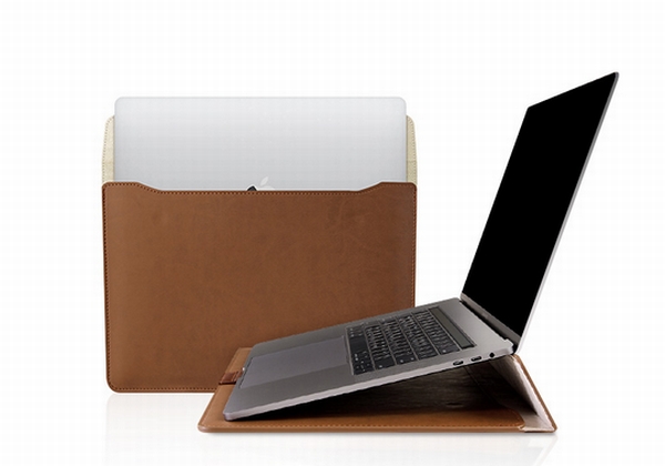 本製品は、収納とスタンドの2機能を併せ持つポーチ。ケースのポイント部分とカバー部分を使ってMacBook Proを立たせることができ、タイピングに適した角度を保つことができる。また、MacBook Proの下部に空間が生まれるので、放熱効果も期待できる。