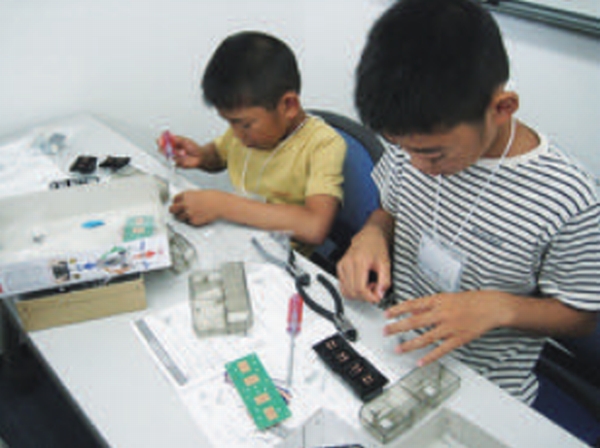 プログラミングコースでは、タミヤ社の新製品「カムプログラムロボット工作セット」をプログラミング学習用にアレンジして使用。子どもパソコン「IchigoJam」でBASIC言語によるプログラミングを学び、ロボットを制御するための基礎が学習できる。