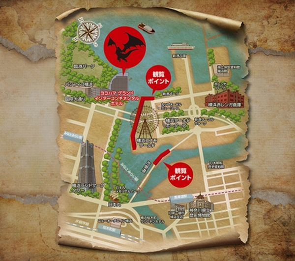 『海洋都市ヨコハマ「龍神バハムート、襲来」』は無料で観覧することができ、上映時刻は、19:20〜/19:50〜/20:20〜/20:50〜/21:20〜の1日5回を予定。