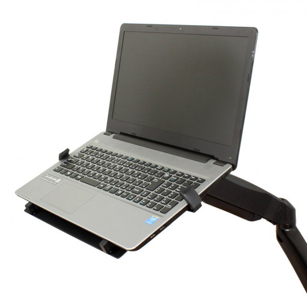 VESA規格に対応したモニターアームに固定するだけで、すぐにノートPCアームとして使用できる。トレイの固定は、アーム側のVESA規格100mmと75mmのネジ穴に各2本ずつ、合計4本のビスで固定する。重量は約1.2kg。