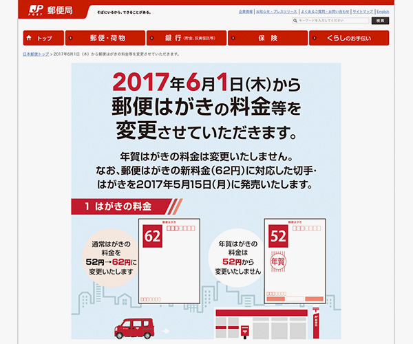 2017年6月1日(木)から、郵便ハガキの料金が変更される。これまで通常ハガキの料金は52円であったが、6月1日(木)からは62円へと値上げ。往復ハガキも124円となり、そのほかに定形外郵便物の料金も一部変更される。これに伴い、新料金に対応する切手やハガキは、5月15日(月)から発行が開始された。なお、年賀ハガキは現行料金の52円のまま据え置きとなるが、かもめ〜るについては通常ハガキと同様に62円となる。
