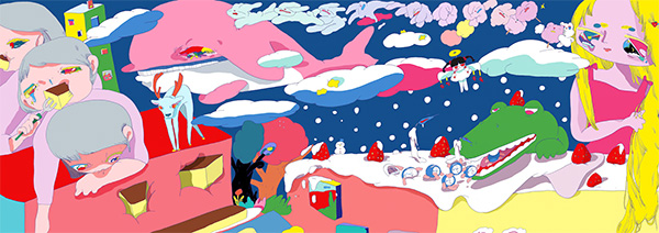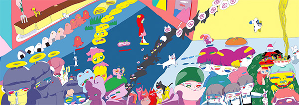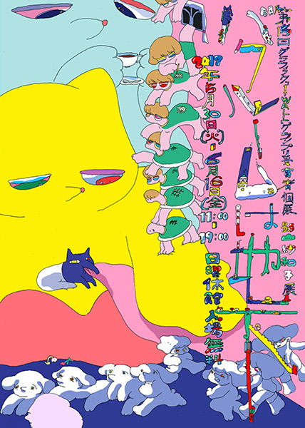 彼女の作風は、ヴィヴィッドな色をユニークに組み合わせて、紙に1コマずつ静止画を連続して描き、まるで映像のようにイラストレーションを展開させるもの。作品の中では女の子 / 動物 / 食べ物 / 部屋の中などをカラフルな色でポップに描き、楽しく伸びやかな表現を行っているが、よく見るとグロテスクな要素が含まれ、そこから重層的なストーリーも読み取れる。会期中の6月16日(金)19:10〜20:40には、影山氏のほか、グラフィックデザイナーの大原大次郎氏を招いたトークイベント「バクルームのつくりかた」も実施(参加無料 / 要予約)。