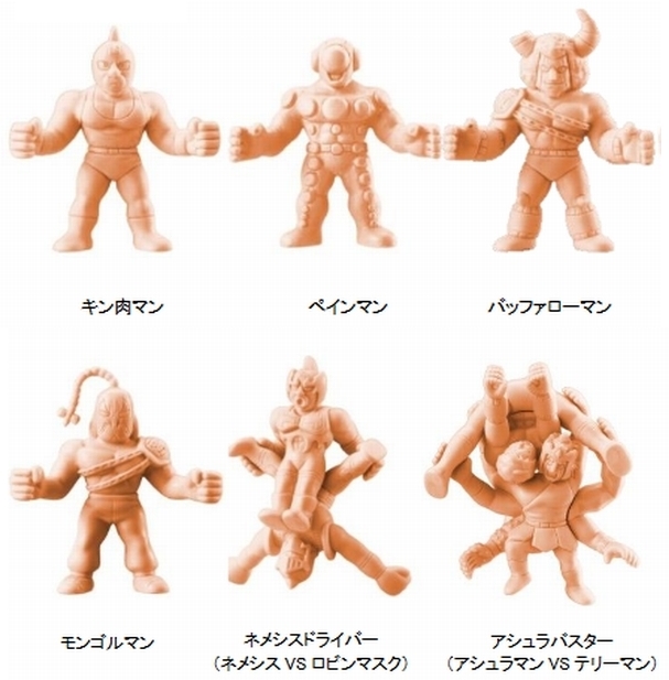新たに発売されるのは「キン肉マン、ペインマン、バッファローマン、モンゴルマン、ネメスドライバー(ネメシスVSロビンマスク)、アシュラバスター(アシュラマンVSテリーン)」の6タイプで、それぞれ赤・ペールオレンジ・青の3カラーがあり、全18種類がラインアップされる。