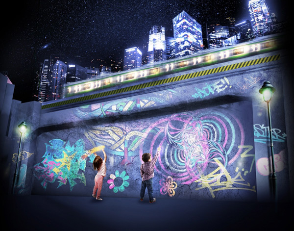 たとえば“新宿エリア”は、ゴジラとパックマンが、プロジェクションマッピングやスモークなどを活用した大迫力の演出で登場。2017年夏にオープンするエンターテインメント施設「VR ZONE SHINJUKU」(株式会社バンダイナムコエンターテインメント)とのコラボレーション企画で、施設オープンから開始される実際の店舗での演出と、本イベントのアート空間との連動が行われる。このように、今回のイベントではリアルとバーチャルがシンクロするような仕掛けも特徴。電車の運行情報など、東京の時間軸と連動した演出も展開される。そのほかの代表的なコンテンツとしては、「デジタル落書き」も特徴的。これは“渋谷エリア”裏の高架下を彩るアート体験で、大人も子どもも“街”へのデジタルでの落書きを楽しめる。