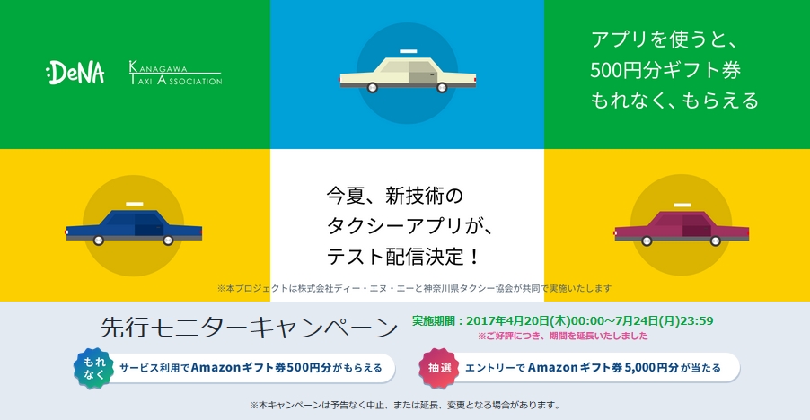 株式会社ディー・エヌ・エーは23日、タクシーの配車をスムーズに実施できるios用タクシー配車アプリについて、横浜市と一般社団法人神奈川県タクシー協会の協力の下、横浜市の限定エリアで約2ヶ月間の実用実験を実施すると発表した。