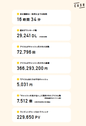 リリースから停止までのデータは公開されており、16時間34分で7万2796個のアイテム、3億6629万3200円がキャッシュ化されたとしている。