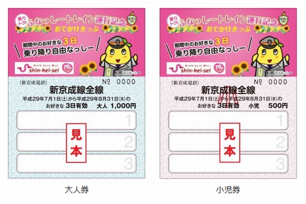 企画乗車券「乗りトク!ふなっしートレイン運行記念 おでかけきっぷ」の発売も行われ、ふなっしーデザインの、新京成線3日乗り降り自由チケットが1000円(小児500円)となっている。