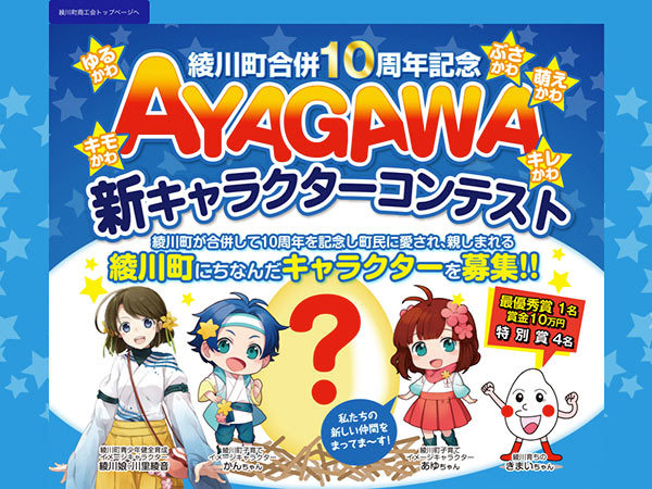 綾川町の合併10周年を記念して作品を募集している「AYAGAWA 新キャラクターコンテスト」