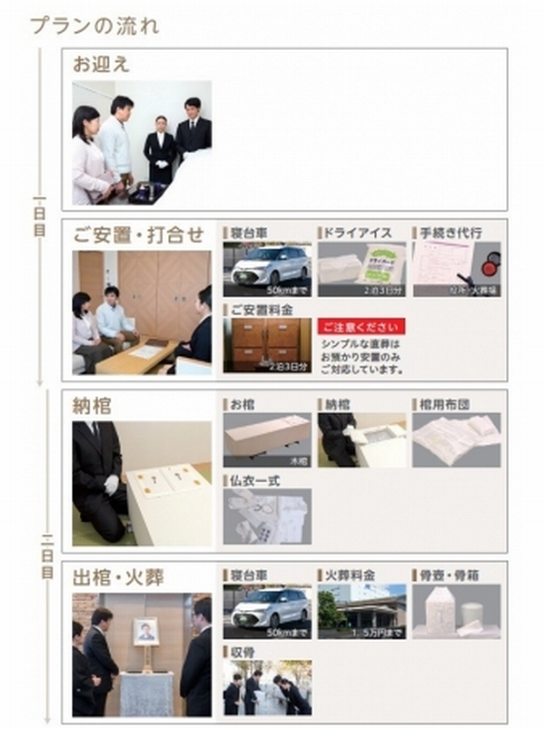 Yahoo!ショッピング店で提供するプランの一例としては、ご遺体のお迎え・安置(2泊3日まで)・火葬・拾骨・解散という流れの「シンプルな直葬」を13万3000円(税込)で提供する。(資料請求申し込みで5000円割引)