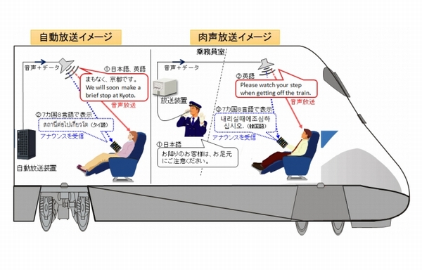 実証実験では、新幹線のN700系の2編成において、列車内の「案内放送」(自動放送と一部の車掌の肉声放送)を任意の言語(日本語、英語、中国語(繁体・簡体)、韓国語、タイ語、フランス語、スペイン語)に翻訳表示する。