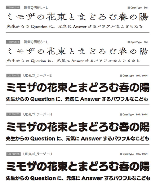 今回追加される「LETS」新書体(フォントワークスコレクション)は、筑紫書体シリーズの「筑紫Q明朝」のラージとスモール、「UDフォント」シリーズの丸ゴシック体である「UD丸ゴ」のラージとスモール、多言語フォントとして「FWアラビア」と「FWヒンディ」のR / DB / Bウエイト。「UD丸ゴ」では、ラージ / スモールともにE / H / Uの3ウエイトが用意されている。MacにはOpenType、WindowsにはOpenType / TrueType形式での提供。「筑紫Q明朝」の2ウエイトはStd仕様で、「UD丸ゴ」はPr6 / Pr6N仕様となっている。