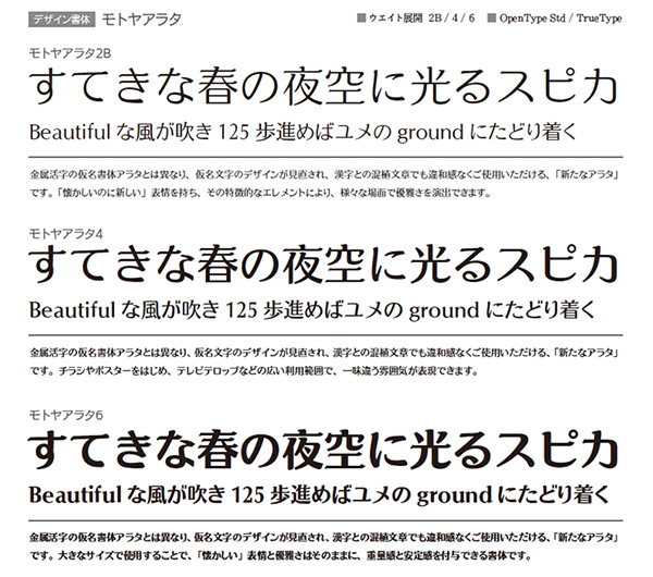 「モトヤLETS」新書体(モトヤコレクション)は、「モトヤアラタ」の3ウエイト(2B / 4 / 6)。仮名フォントの「Mkアラタ」のレトロな雰囲気はそのままに、「Mkアラタ」のエレメントの特徴を持った漢字を収録し、さらに仮名もリデザインされたフォントだ。MacにはOpenType、WindowsにはOpenType / 外字付きTrueType形式で提供され、OpenTypeフォントはStd版となっている。