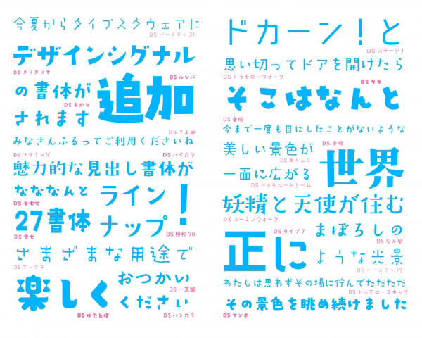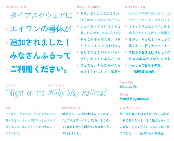 今回追加されたエイワン書体は、ZENオールド明朝 N(5ウエイト)、ZEN角ゴシック N(5ウエイト)、ZEN丸ゴシック N(5ウエイト)、ZENアンチック、ZENアンチックS、紅道、Zen Loop、Zen Loop Italic、Dots、Tokyo Zoo。シンプルで使い勝手の良いラインナップだ。デザインシグナル書体では、「きりぎりす」や「そよ風」などの個性的なデザイン系書体を数多く用意。さまざまなジャンルで、注目を集める目的でも使いやすい。
