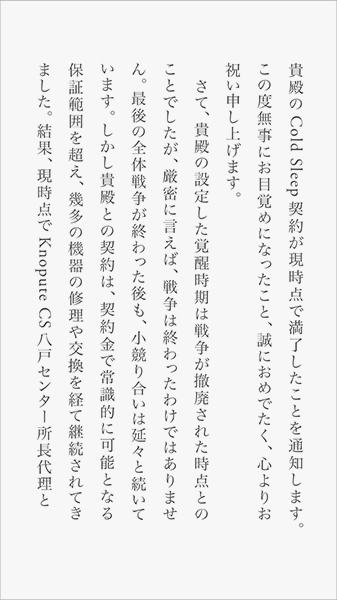 「Yahoo! JAPAN」でのUI / UXのデザインは、株式会社タクラム・デザイン・エンジニアリングが担当した。誌面では実現できないスマートフォンならではのデザイン性や操作性を追求しつつ、小説らしい縦書きの文字組みや、親指だけで操作できる縦スクロールのページ移動を実現。不意に現れる“動く挿絵”も魅力の1つだ。この“動く挿絵”は、アルゴリズムのみを用意して自律的に生成される“ジェネレーティブアート”で、初回公開時に掲載される“動く挿絵”は読者がタップした画面上の位置と時刻をきっかけに生成される仕組み。“読者の数だけ”異なる挿絵が生まれることとなる。