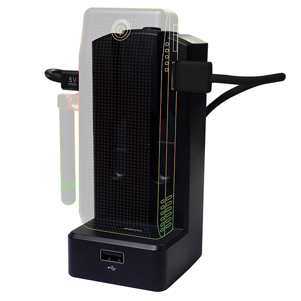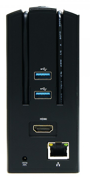 本製品は、スティックPCを縦型にスマートに設置できるドッキングステーションだ。力が加わっても安定して転倒を防止できるように配慮し、底面にはおもりが配置されている。本体正面側にはHDMI入力端子とUSB 2.0ポート、背面側にはHDMI出力端子、2基のUSB 3.0ポート、有線LANポート(1000BASE-T)、電源ポート(DC IN 12Vジャック)を用意。そのほか、スティックPC接続用のUSBハブ用ケーブルや、スティックPCへの給電用のmicroUSBケーブルが直付けされている。このケーブルは、スティックPCを設置していないときには、本体の窪みへスッキリ収納できる設計。本体サイズは57(幅)×128(高さ)×60(奥行)mmで、重量は175gとなっている。
