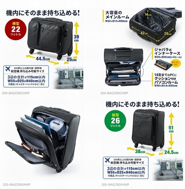 サンワサプライ株式会社は25日、同社が運営する直営サイト「サンワダイレクト」などにおいて、機内持ち込みできるサイズのビジネスキャリー「200-BAGCR003WP_004WP」を発売開始した。価格は「200-BAGCR003WP」1万1852円、「200-BAGCR004WP」1万2778円(各税別)。