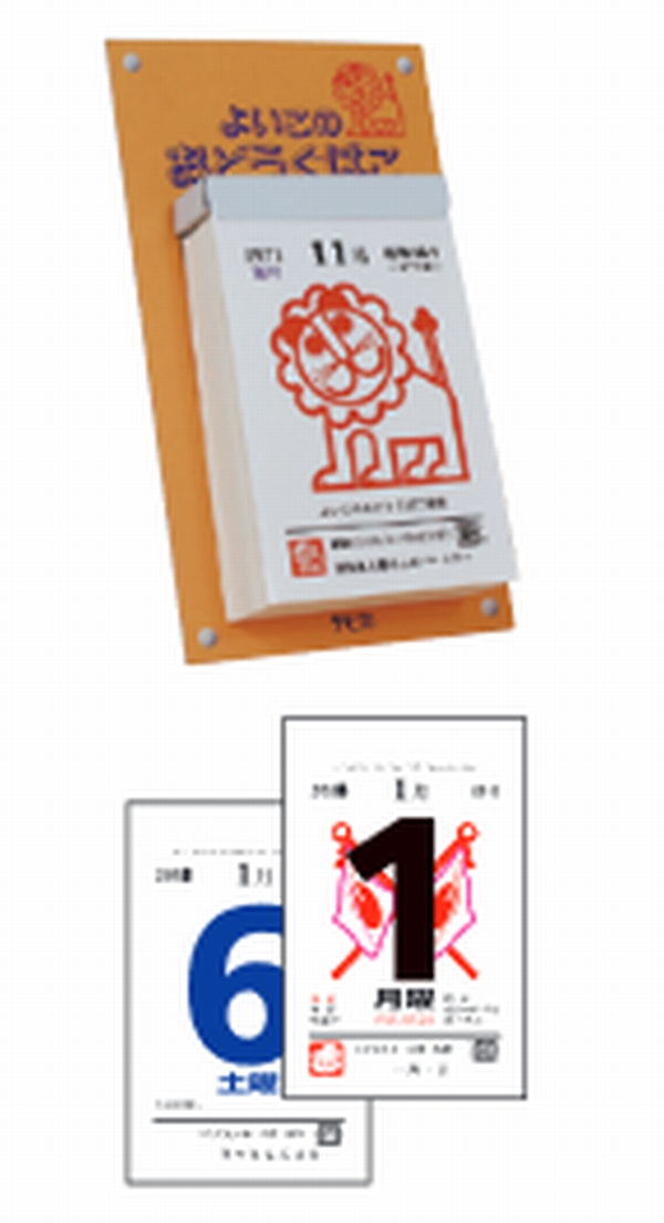 文房具は、日めくりカレンダーの表紙と台紙の部分にデザインされ、中面は昔ながらの日めくりで、文房具の懐かしさと日めくりのレトロさが上手くマッチしたデザインとなっている。