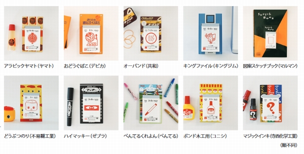 コラボ対象はアラビックヤマト(ヤマト)・おどうぐばこ(デビカ)・オーバンド(共和)・キングファイル(キングジム)・ 図案スケッチブック(マルマン)・どうぶつのり(不易糊工業)・ ハイマッキー(ゼブラ)・ぺんてるくれよん(ぺんてる)・ボンド木工用(コニシ)・マジックインキ(寺西化学工業)。