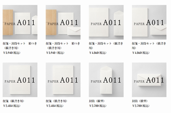 価格については、例えば、白くわずかにラフ寄りのA011を選ぶと、封筒2700円、便箋2484円、便箋・封筒セット4860円、便箋・封筒セット箱つき5940円となっている。この価格は紙の種類によって上下する。