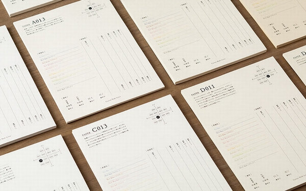 紙は、色が「白」か黄色がかった「クリーム」、手触りがザラザラな「ラフ」か滑らかな「ツル」の4つの指標から、バランス良く12種類を用意。質感や色が異なり、筆記特性もさまざまで、インクのにじみ具合や書き味の違いが楽しめる。