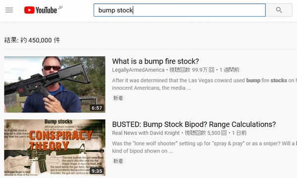 ラスベガスでの乱射事件では、犯人は、銃を半自動で連射できるように改造していたことが明らかになった。これは、「bump stock(バンプストック)」と呼ばれる装置をライフル銃に装着するもので、規制前はYouTubeにバンプストックの取り付け方法解説動画は溢れていた。