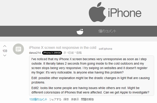 また、アメリカの掲示板サイトRedditには、「室内から寒い屋外に出たらスクリーンがスワイプに反応しなくなった」という報告があり、他のiPhoneXユーザーからは、「同じように低温だと反応が悪い」「自分のiPhoneXは、2度でも平気だった」など、色々な反応が寄せられている。