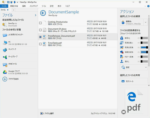 今回のバージョンでは、起動が高速化したほか、画像の取り扱いに関連する強化も行われた。画像フォーマットの変換に対応し、画像ファイルのサイズを瞬時に小さくしてJPEGからPNGなど画像形式の変換が可能。ZIPファイルに追加するだけでなく、デスクトップに保存することも可能だ。また、さまざまなファイルからのEXIFデータの手軽な削除も実行できるようになった。このEXIFの削除機能は、DOC / DOCX、GIF、JPG(JPEG)、PDF、PNG、PSD、PPT / PPTX、XLS / XLSXに対応している。