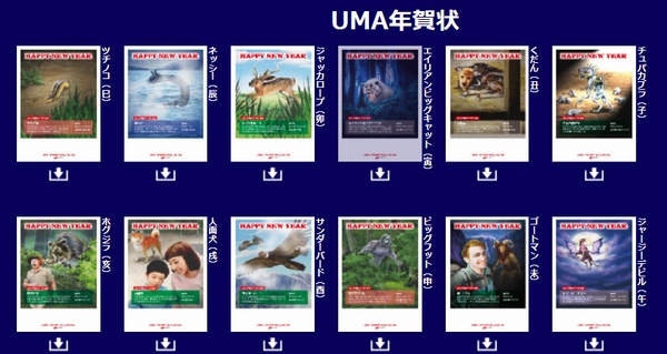 「UMA年賀状」は、干支の動物を、謎に満ちた世界の隠棲動物たちに置き換えたもの。2018年の干支・戌は人の言葉も話す人面犬になり、今年の干支だった酉は人間を襲うこともあるというサンダーバードになっている。「UMA年賀状」は、全てPNG形式でダウンロードすることができ、年賀状の素材として使うことができる。