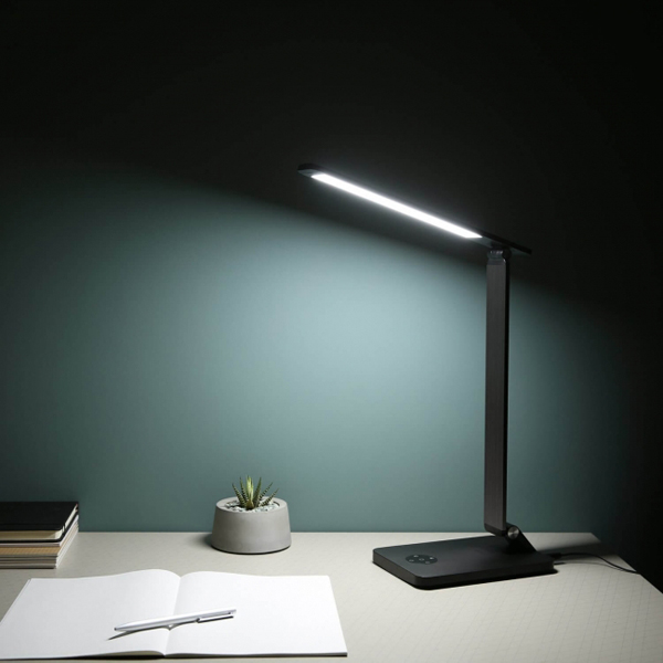 同製品は、ブラッシュドアルミニウム製でシンプルなデザインのデスクライト。平面発光の設計により光がワイドに広がるため、長時間の勉強でも目が疲れにくい。タッチセンサーで明るさや色温度を調整することができる。