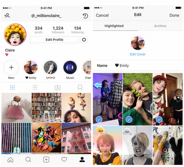 また、ストーリーを「ハイライト」として編集する機能も追加。これはプロフィール直下の新たなセクションに表示されるもので、アーカイブからお気に入りのストーリーを選んで名前をつけて表示させることができる。