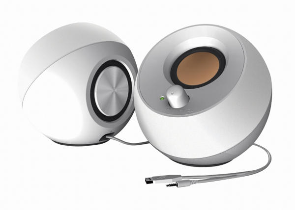 同製品は、コンパクトな球状デザインの2chスピーカー。PCのUSBポートに接続してUSBバスパワーでの動作が可能で、コンセントを使わずに利用できる。リスナーにサウンドがダイレクトに伝わるようにスピーカードライバーが45°上向きに配置されており、背面にはパッシブラジエーターを搭載し、重低音の効いたサウンドを楽しめる。