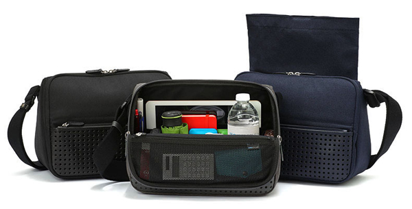 ファスナーを開くとフタが倒れて、二等辺三角形のバッグが開いた状態をキープできる。バッグのフタを荷物の入るスペースの高さギリギリまで倒れる構造にしたことにより、俯瞰するように底の方まで見やすくなっている。カラーはブラック、グレー、ネイビー、ブラウンの4色。