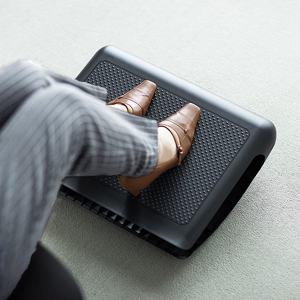 本製品は、足を快適にサポートするフットレストだ。足を置く台の角度はフリーで、底面がなだらかなカーブ形状となっており、足で動かして角度の調整が可能。ゆらゆらと動いて、デスクワークの疲労を軽減する(角度固定は不可)。足をフットレストに乗せることで太ももが圧迫されず、脚がふらつきにくくなる効果もあり。表面部分には凸凹があり、乗せた足をしっかりと安定させられる。