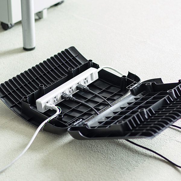 フットレストの内部に用意されたケーブルボックスにより、電源タップや余剰ケーブルを収納できるため、足元に散らかったケーブル類をまとめてすっきりと片付けながら使えるところも魅力。底面にはゴムシートが付いており、設置した位置がずれるのを防ぐ。フットレスト使用時の本体サイズは約447(幅)×109(高さ)×357(奥行)mmで、重量は約1.51kg。