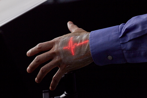 国立大学法人東京大学と大日本印刷株式会社の研究チームは、アメリカ科学振興協会(American Association for the Advancement of Science; AAAS)の年次大会で、薄型で伸縮自在な「スキンディスプレイ」の製造に成功したことを発表した。この研究は、国立大学法人東京大学 大学院工学系研究科の教授である染谷隆夫博士を中心としたチームによるもの。この技術を活用し、皮膚に直接貼り付けて使う薄型かつ伸縮自在なセンサーで計測した心電波形の動画を、同じく皮膚に貼り付けた「スキンディスプレイ」へ表示させることが可能となっている。