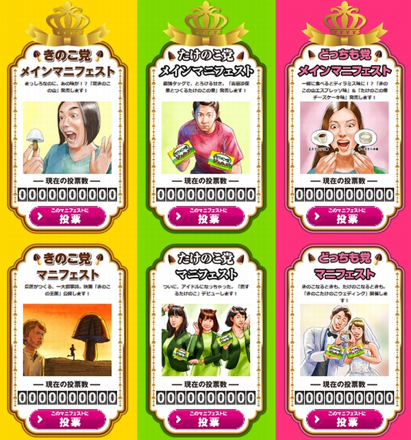 マニュフェストは、きのこ党は「真っ白いきのこの山」「映画きのこの王国公開」「AI女子高生KINO開発」など、たけのこ党は「吉田沙保里とつくるたけのこの里発売」「たけのこの里ホレホレ体験会」「AIスピーカーTAKE開発」、新党どっちも党は「きのこたけのこウェディング開催」などとなっている。
