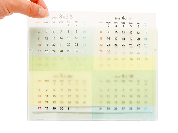 「グラシン卓上カレンダー」では、各シートに“前月”と“当月”の2カ月分が表示されており、後ろのシートと重なることで“翌月”や“翌々月”もうっすらと透けて見える仕掛けだ。これを実現したのが、半透明のグラシン紙。月日の流れが、紙の工夫によって視覚的に表現されている。翌月より先の予定を各シートへ前もって書き込んでおくことで、月が変わってシートを抜くたびにその予定が濃くなり、徐々に近づいてくるように視覚的に感じられることも特徴だ。