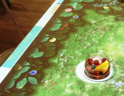 店内のテーブルには本の世界が映し出され、客の動きに応じて花が咲き、鳥が飛び去るなど、インタラクティブかつファンタジックな映像の変化も見どころ。3月中旬からは、注文した飲食を棚に並ぶ本の中から受け取るなどのギミックも導入される。