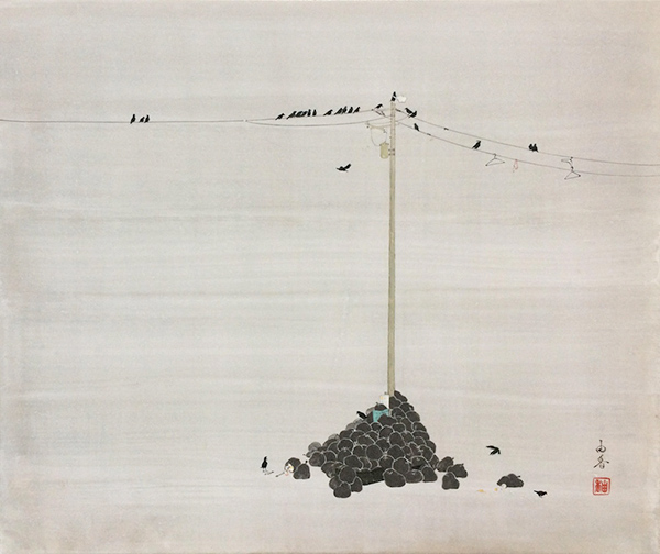 本展でも、日常風景を“こうだったら面白いな”と思う景色に変えたりしたユニークな作品を展示。大量のゴミ袋を下に電柱の頂点で世界を征した気になっているカラスや、輸入品の高い紅茶のパックが“新入り”として常備品の安い“緑茶先輩”にいびられている様子、尾形光琳の屏風絵に見られる波模様を“流しそうめん”に見立てた景色など、新作を中心に約20点が紹介されている。