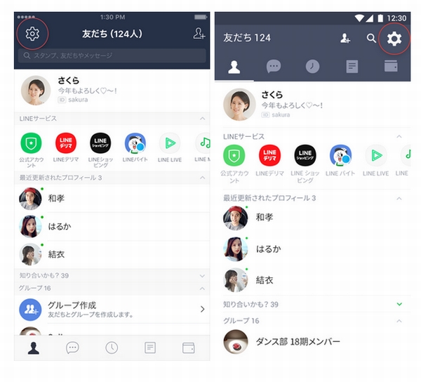 今回のアプデでは、頻繁に使うことの多い機能を「友だち」タブに集約。まず、友だちタブの上部に歯車アイコンの「設定」へのリンクを搭載。プロフィールやアカウントなどLINEの設定変更が可能になった。プロフィール設定はアイコン以外からも、自分のプロフィールをタップしてポップアップ画面を表示させて変更することもできる。